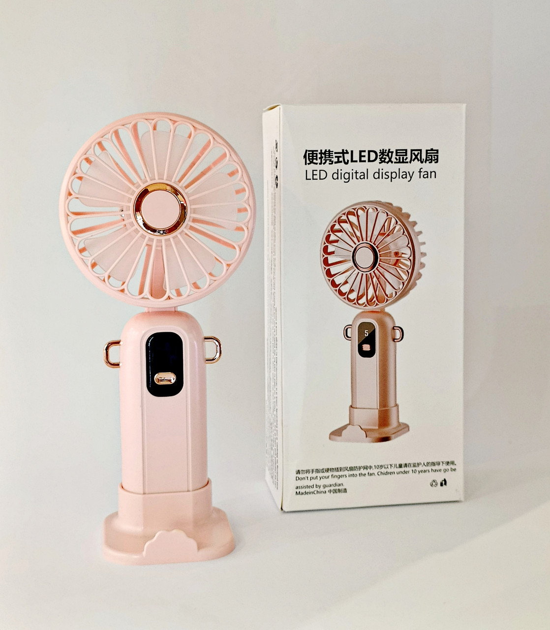 Вентилятор портативний акумуляторний, розмірами 20 см*10 см*4 см, встановлюється на підставку або чіпляється за спеціальний шнурок.